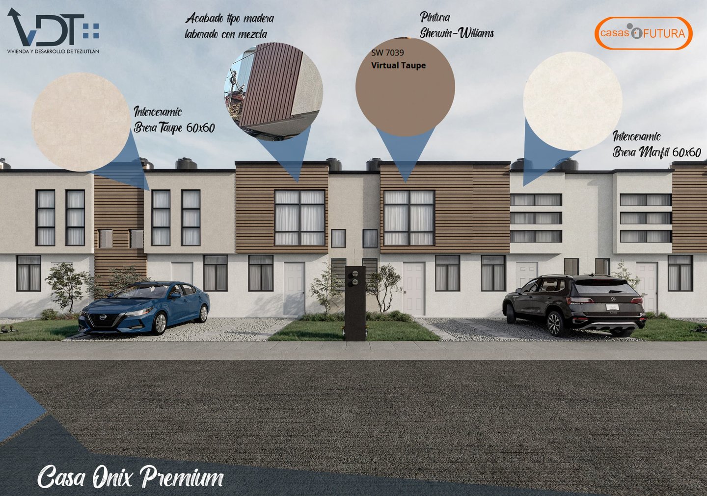 Las viviendas tipo MALAGA tienen un diseño contemporáneo con líneas rectas, acabados en tonos neutros (blanco, gris y negro), detalles aparentes en tipo madera, duela que aportan calidez y contraste. Cada casa cuenta con balcón en planta alta, ventanales amplios que favorecen la entrada de luz natural y portones metálicos horizontales que otorgan seguridad con un estilo uniforme. La composición es simétrica, ordenada lo que refuerza la imagen de un desarrollo residencial bien planeado y estéticamente atractivo.